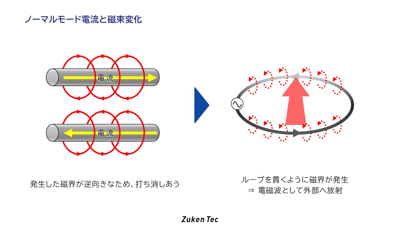 ただし、このノーマルモード電流がループ状に流れた場合、ループを貫くように磁束変化が生じることにより電磁波が生じます。