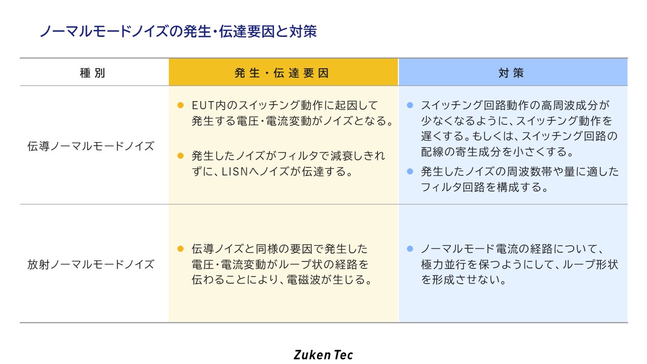 この表をご覧いただくと、ノーマルモードノイズに対する対策は、それほど難しい内容ではないのでは?という気がしてきます。