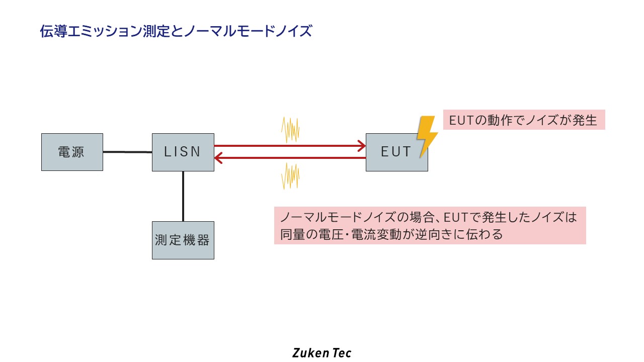 したがって、伝導EMIにおけるノーマルモードノイズはEUTの動作によって発生し、その際の電圧・電流変動がEUTとLISNの接続を伝達経路として伝わっている。と整理することができます。