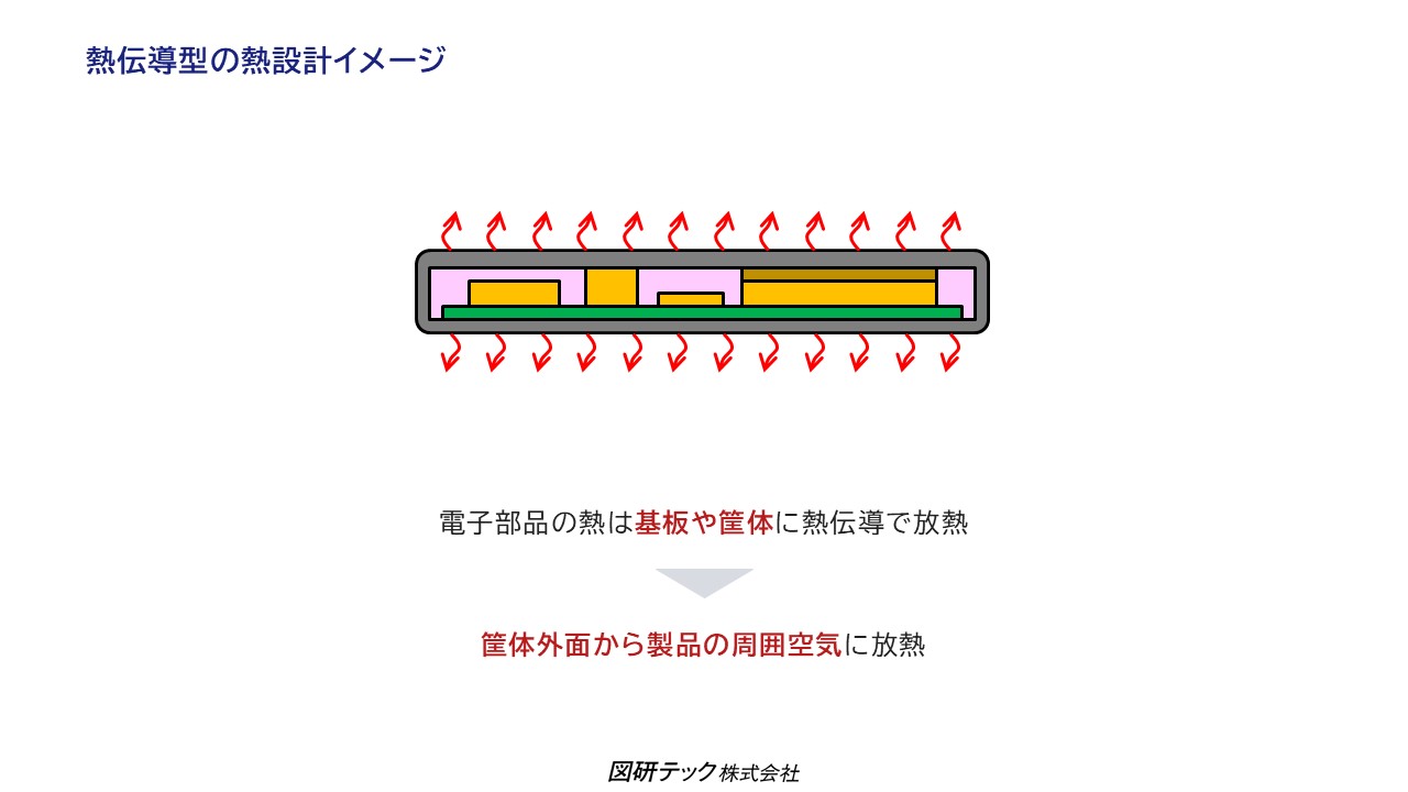 ところが電子機器が小型・高密度化することで、製品内部の空間が極端に狭くなり、内部空気の循環ができなくなったことから、内部空気への放熱ができなくなってきました。このため電子部品の熱は、部品を搭載している基板や、部品近傍の筐体面などの固体に接触させて伝わる、熱伝導による方法(これを以下では「熱伝導型」と呼びます)が増えています。